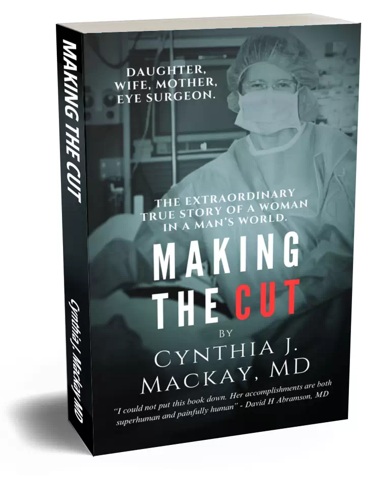 After Dr MacKay graduated from Harvard in 1964, she spent the next 9 years focusing on her husband and two children. She squeaked into medical school despite discrimination for her age (31), gender, and status as a mother. After completing an eye surgery residency and fellowship at the Harkness Eye Institute (where she was the fourth female resident), she went on to build a private practice, perform significant scientific eye research, teach at the prestigious Lancaster Course for 17 years, and become a Clinical Professor of Ophthalmology,